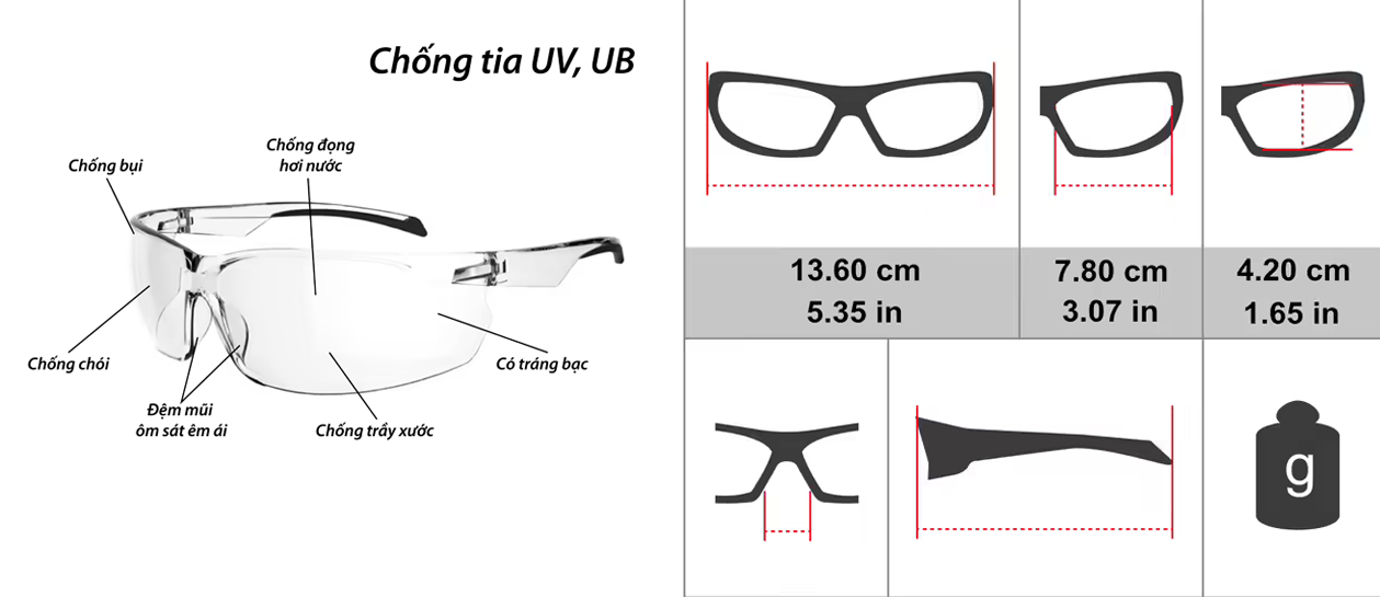 Chất liệu: Polycarbonate chống sương mù, chống trầy, chống chói.